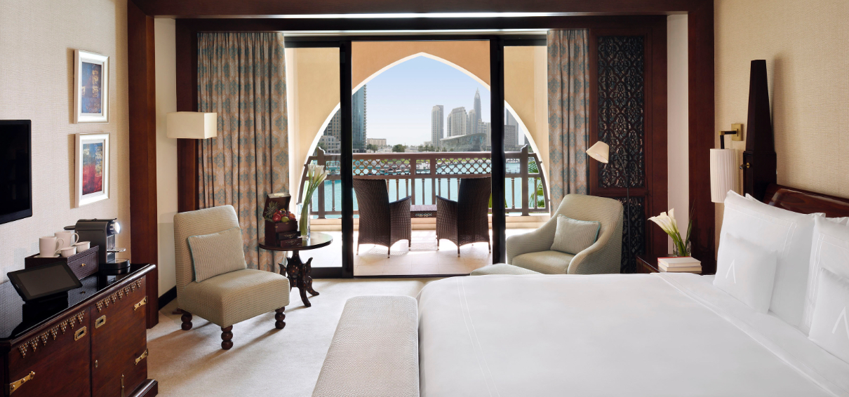 ドバイの見どころが集まる中心地に位置する好立地ホテル。アラビアンな雰囲気が漂う内装は、上品で落ち着いた印象です。世界トップクラスの噴水ショー、ドバイ・ファウンテンを眺めることができる「ファウンテンビュー」のお部屋を指定するのがおすすめです。